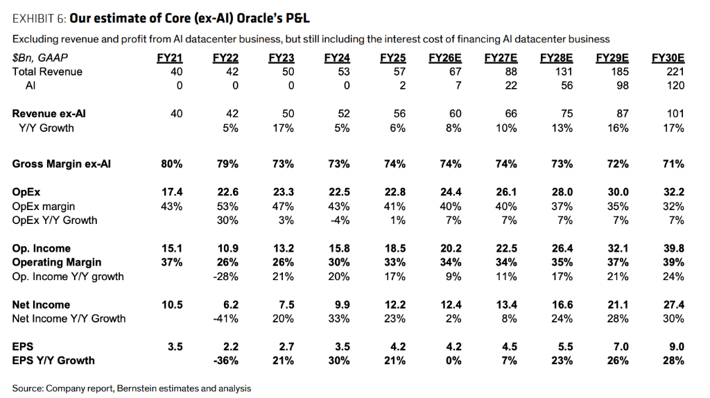 伯恩斯坦在最新模子中进一步剥离AI业务,明晰勾画出甲骨文中枢业务的孤苦价值。即便全王人剔除AI数据中心关连收入,仅凭传统数据库、SaaS及OCI业务,公司到2030财年的总收入仍可达1010亿好意思元。