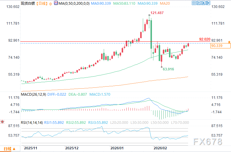 不外需要精熟的是,即便面前银价走势强健,多头仍需冲破关节阻力位智商不时上行趋势:领先要攻克2月4日创下的92.20好意思元前期高点,冲破该位置后,将进一步靠近92.87—99.66好意思元的进军回调阻力区间,这一区间是前期银价高涨历程中的关节整理区域,瞻望将靠近较强的赚钱盘抛压。