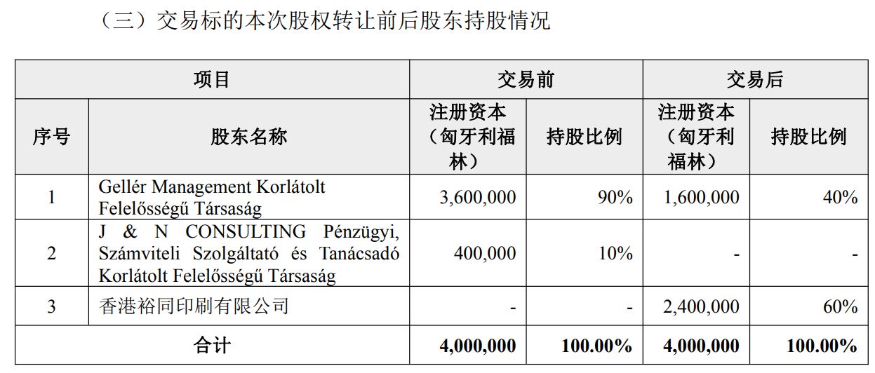 此外,走动完成后,Gelbert的股权结构将发生根人性变化:香港裕同将握有60%的股权,成为控股鼓励;而原大鼓励Gellér Management Kft(卖方1)的握股比例将降至40%,原小鼓励J&N CONSULTING则澈底退出。